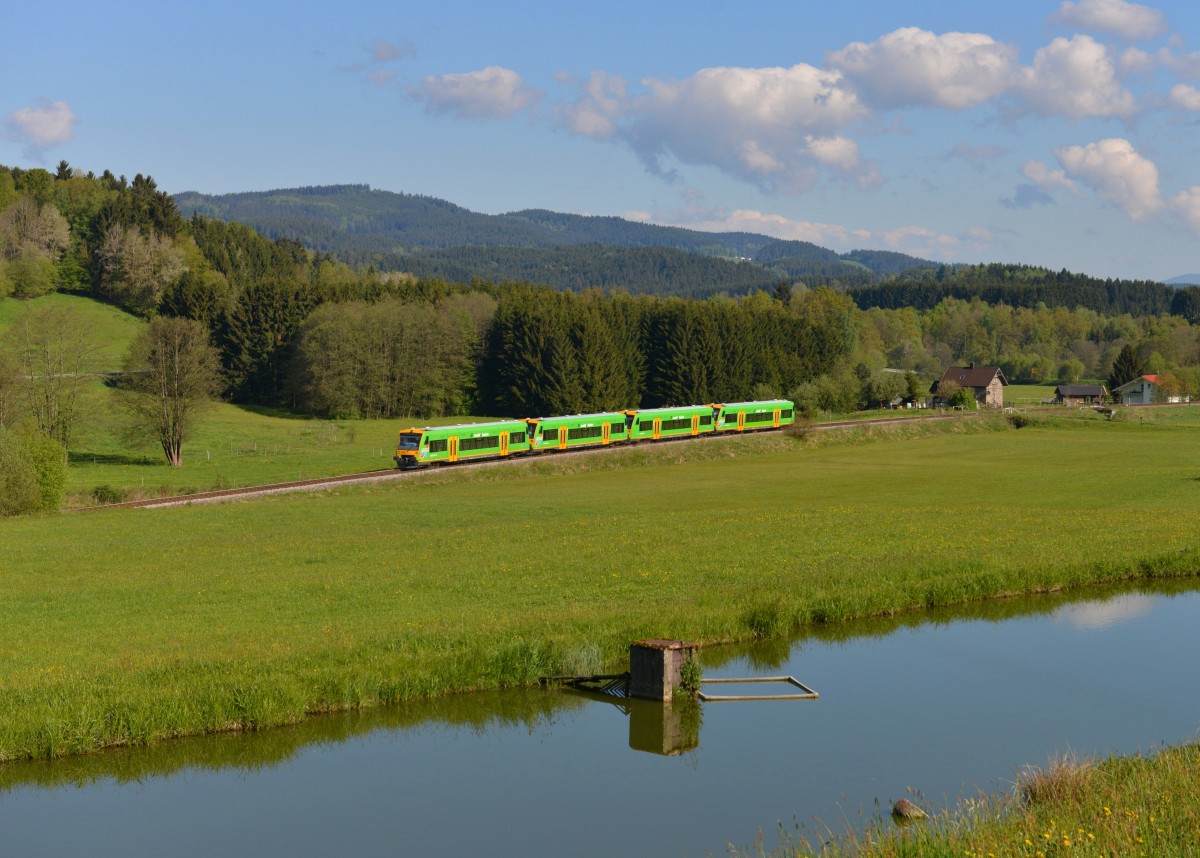 650 653 (VT 18) + 650 650 (VT 15) + 650 655 (VT 20) als WBA1 nach Bayerisch Eisenstein am 04.05.2014 auf der Ohebrücke bei Rohrbach.