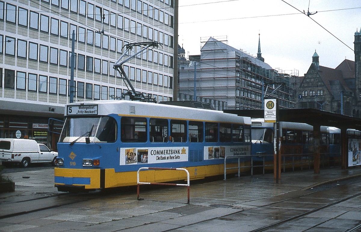 Tw 519 der Straßenbahn Chemnitz im April 1997 an der Zentralhaltestelle. Von der früheren 925 mm-Straßenbahn ist nichts mehr zu sehen, auch die Tatrawagen sind inzwischen modernisiert und neu lackiert.