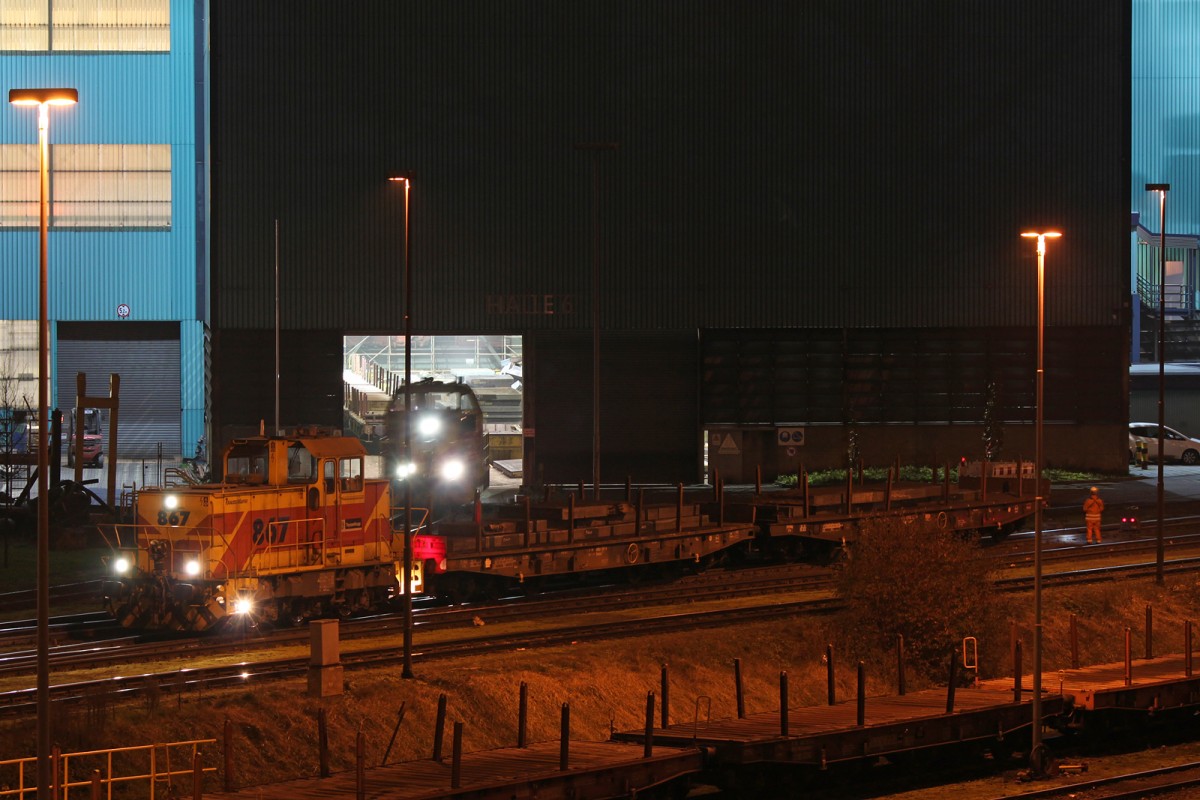 TKSE 867 am 20.11.14 mit einem Brammenzug in Halle 6 bei HKM.