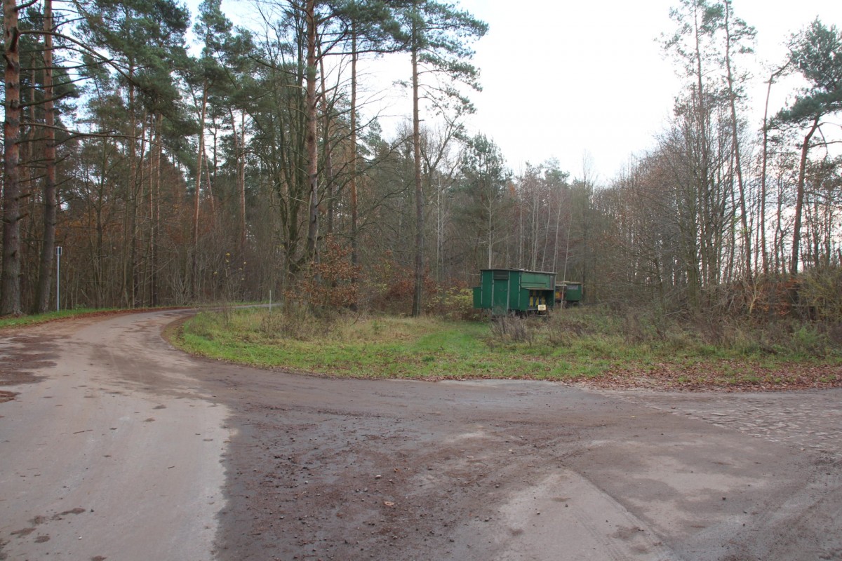 23.11.14 Seit 1945 stillgelegte / abgebaute Strecke Templin - Fürstenwerder, Bf. Knehden. Neben der Laderampe ist eine gepflasterte Straße (Vordergrund), die scheinbar grundlos zum Waldrand führt, weiteres Indiz für die Bahnanlage.