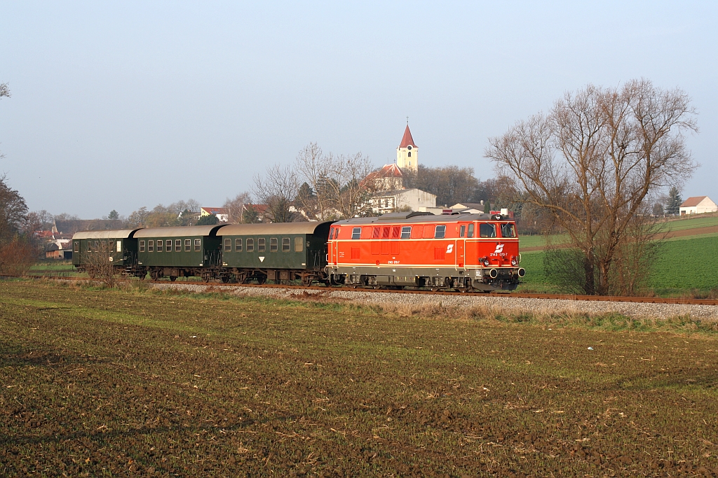 NLB 2143 070-7 am 23.November 2014 mit dem SR 17918 zwischen Pernersdorf und Peigarten. Im Hintergrund die Pfarrkirche Pfaffendorf.