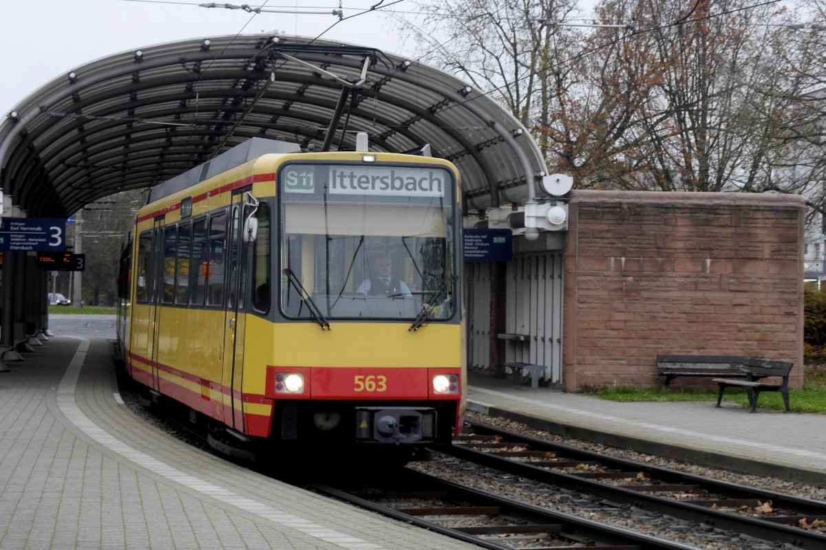 Wagen 563 mit angehängtem Zweiteiler 507 als S 1 beim Verlassen des Karlsruher Albtalbahnhofs am 29.11.14.