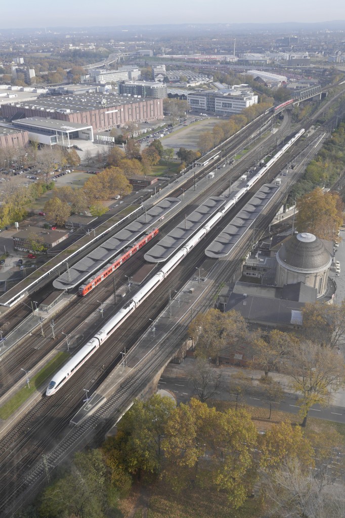 Ein LINT 81 fährt als RB 25 Richtung Meinerzhagen in den Bahnhof Köln Messe/Deutz ein (9.11.14), aufgenommen von der Aussichtsplattform des Büroturms am Deutzer Rheinufer.