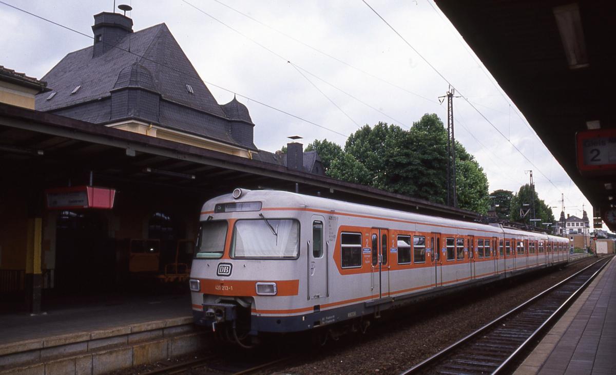 420213 am 3.7.1988 um 11.17 Uhr als S Bahn nach Frankfurt am Main im Bahnhof Friedberg.