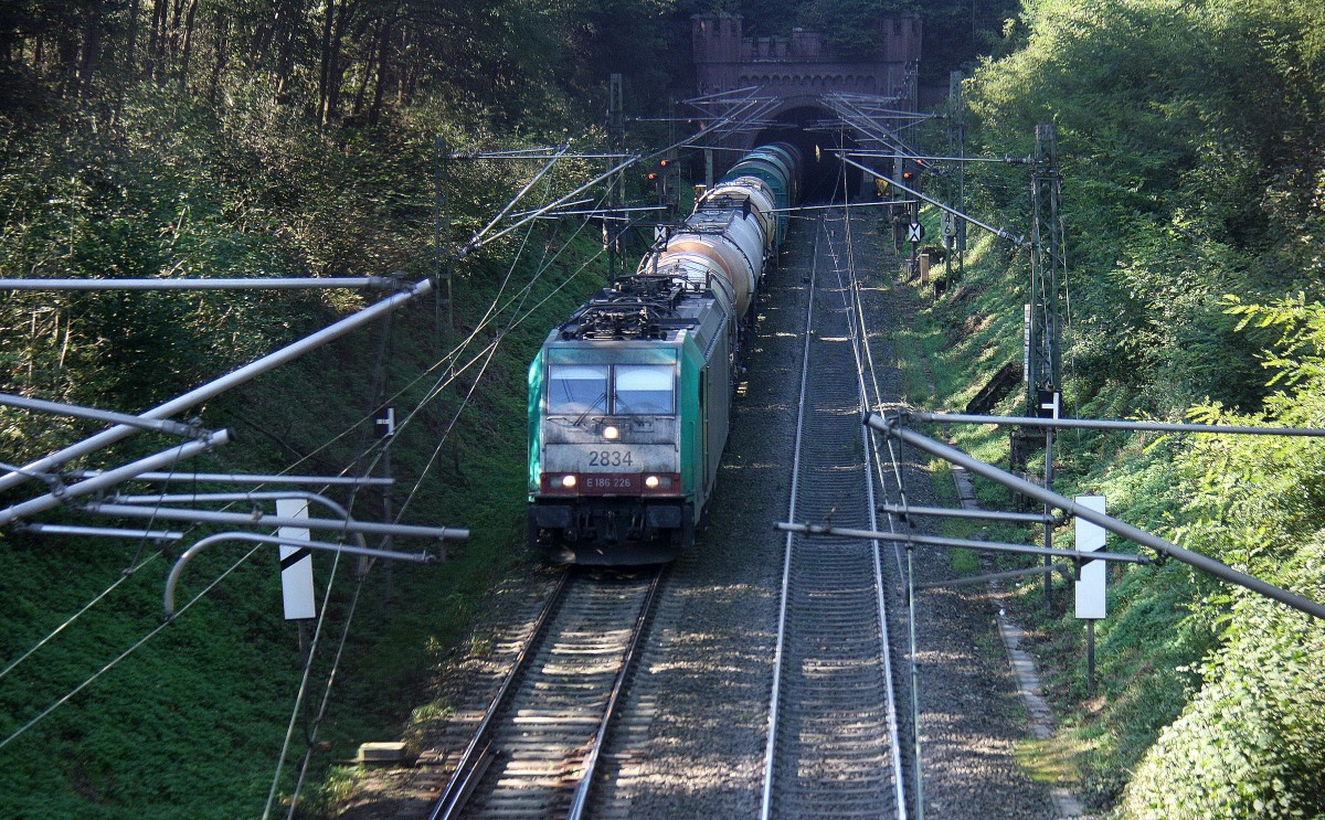 Die Cobra 2834 kommt aus dem Gemmenicher-Tunnel mit einem langen gemischten Güterzug aus Antwerpen-Noord(B) nach Köln-Gremberg und fährt die Gemmenicher-Rampe herunter nach Aachen-West.