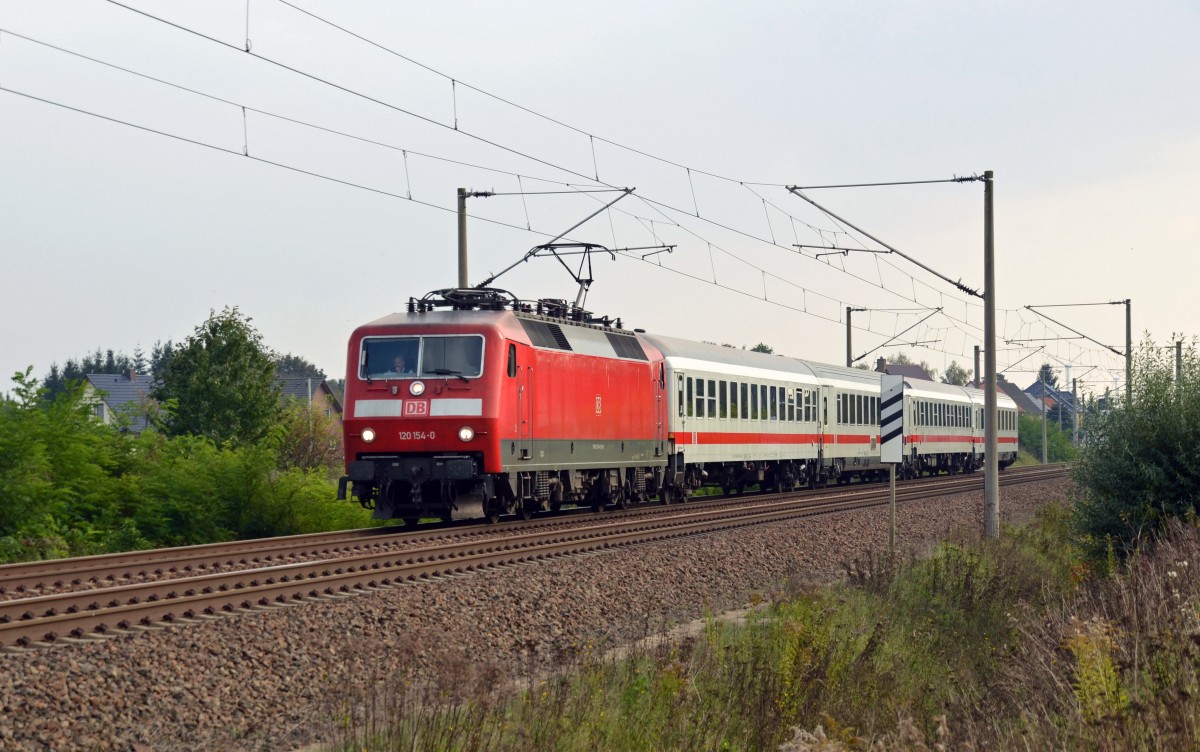 120 154 zieht den IC 1948 Kyffhäuser am 05.10.14 durch Zschortau über Delitzsch nach Halle.