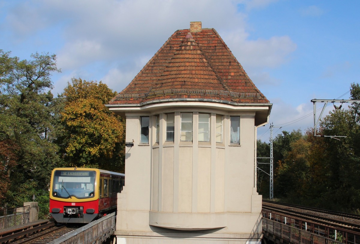 12.10.2014 Berlin-Buch. S2 nach Lichtenrade kommt aus der Kehre Gl. 17 vorbei am denkmalgeschützten Stw Bwt.