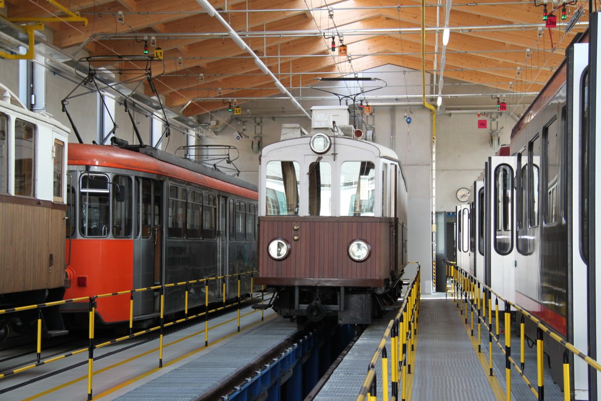 Nur noch sporadisch und zu besonderen Anlässen werden die über 100 jährigen Triebwagen der Rittnerbahn eingesetzt.Links hinten einer der sog."Esslinger" Triebwagen die einige Jahre den Verkehr auf der Strecke bewältigten,um die Altbaufahrzeuge zu entlasten.Oberbozen 07.10.14