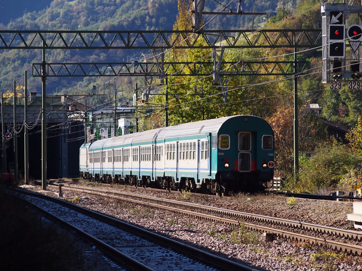 Ein ETR 170 fährt am 20.10.14 als R 5418 von Trento in den Bahnhof Bozen ein.