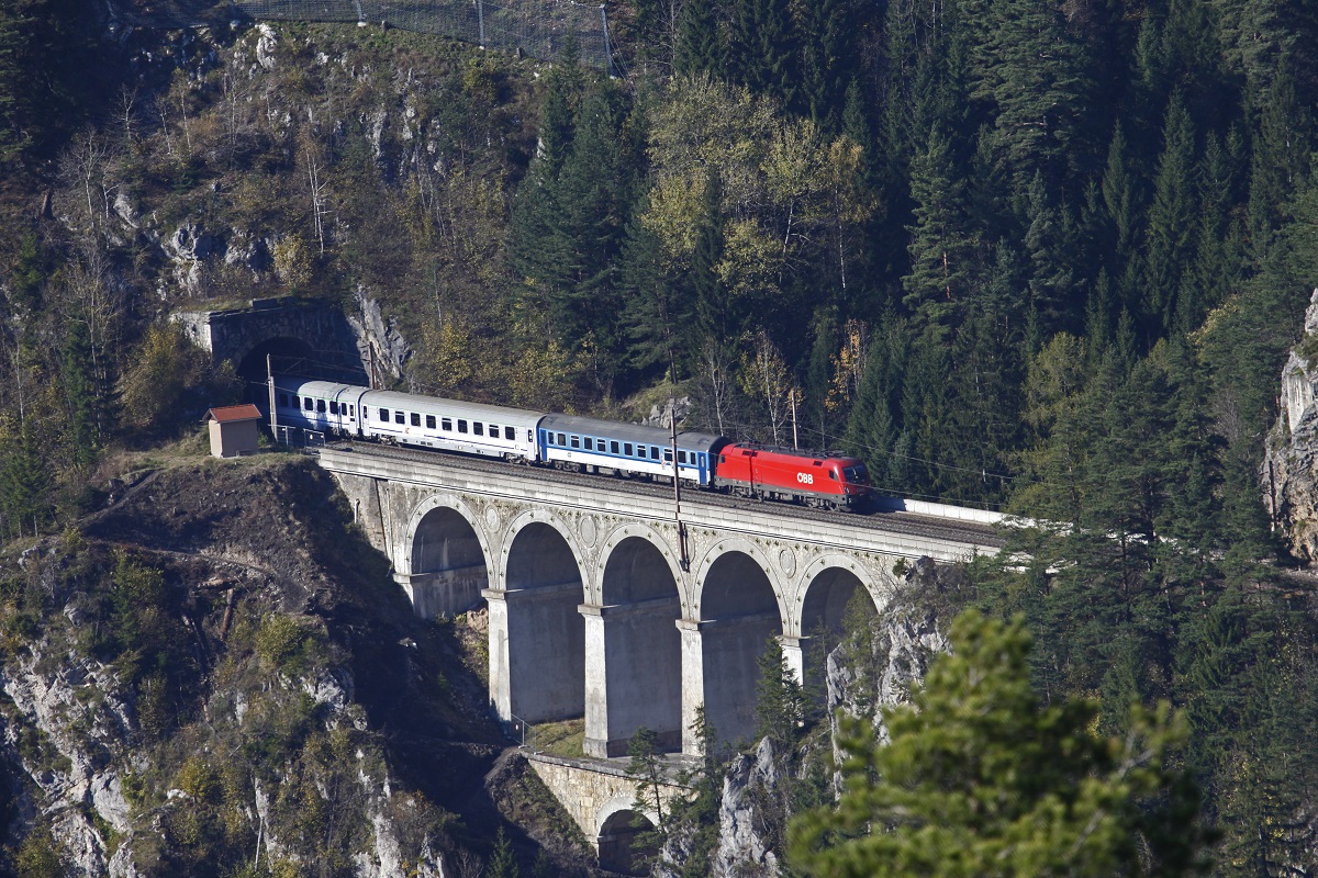 Ein Taurus zieht am 27.10.2014 den Eurocity 102 (Villach - Warschau) über den Krauselkauseviadukt der Semmeringbahn. Das Foto wurde vom sogenannten Zwanzigschillingblick von der anderen Talseite aufgenommen.