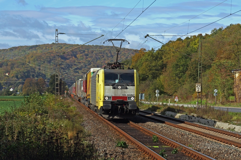189 003-7 ist mit einem Containerzug am 17.10.2014 im Elbtal unterwegs. Hier im Bahnhof Kurort Rathen Richtung Schöna.