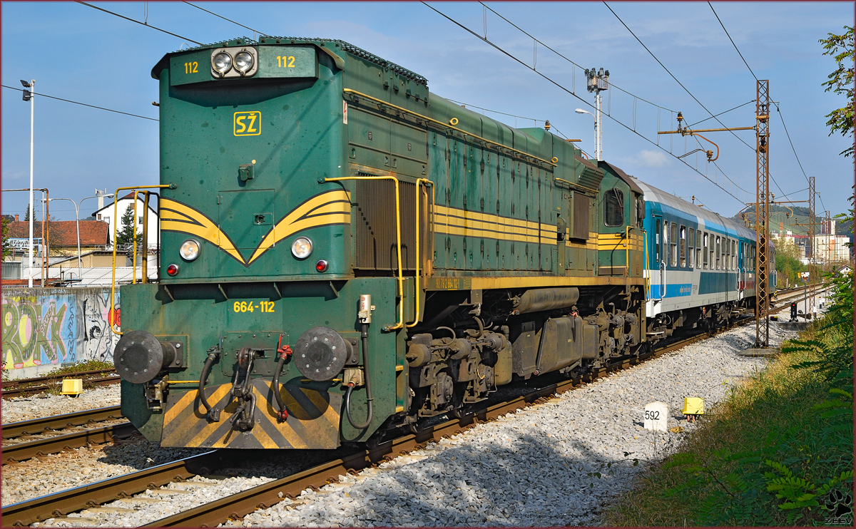 SŽ 664-112 zieht MV247 'Citadella' durch Maribor-Tabor Richtung Budapest. /21.10.2014
