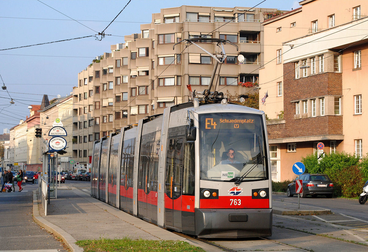 Auch Fahrzeuge der Reihe ULF kamen zum Einsatz wie hier der B1 763 in der Heiligenstädterstraße bei der Haltestelle Grinzinger Straße. (04.10.2014)
