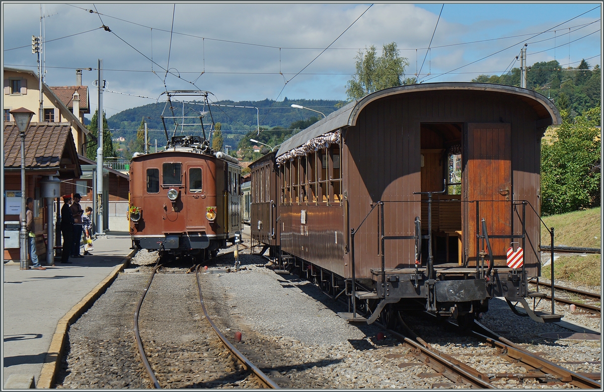 Lok Nr. 3 der Brig-Furka-Disentis-Bahn, später Furka-Oberalp-Bahn, mit ihrem Museumszug am Bahnsteig in Blonay. September 2014.