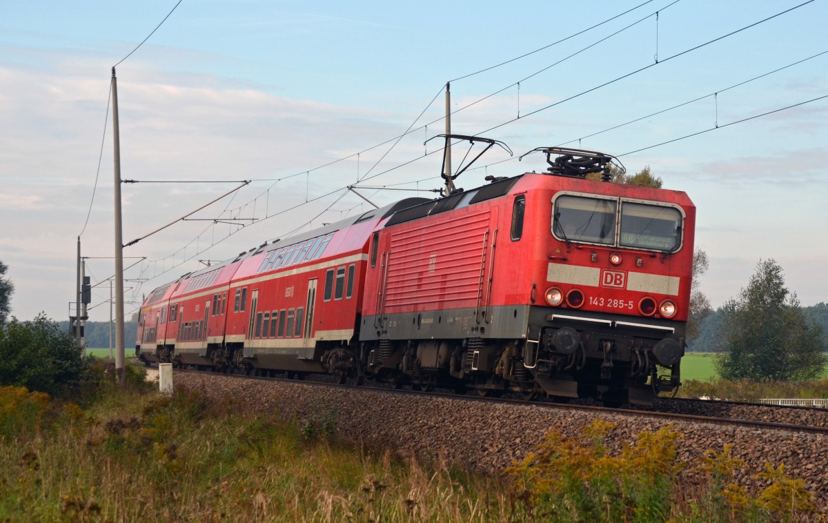Mit einer RB nach Wittenberg erreicht 143 285 am 30.09.14 in kürze den Haltepunkt Burgkemnitz.
