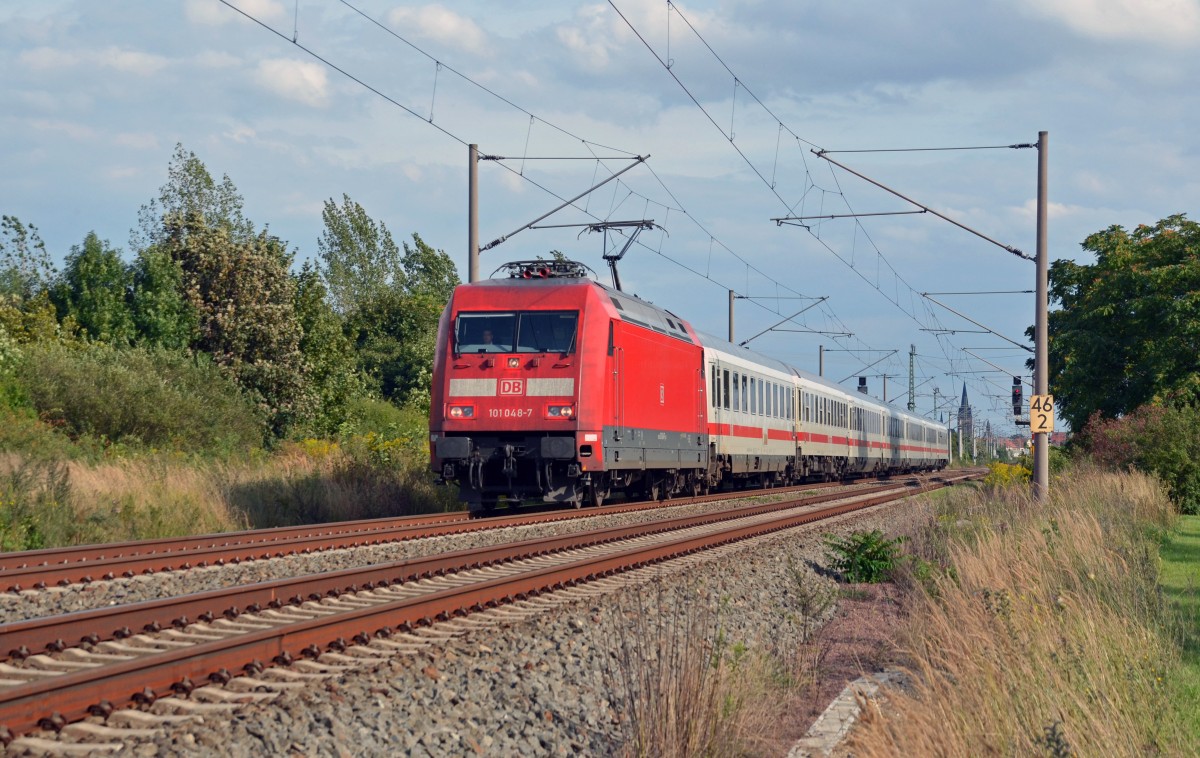 Wegen Bauarbeiten auf der Strecke Halle(S)-Magdeburg wurden einige IC in Richtung Magdeburg ab Leipzig über Dessau umgeleitet. Hier zieht 101 048 den IC 2444 nach Köln durch Greppin in Richtung Dessau.