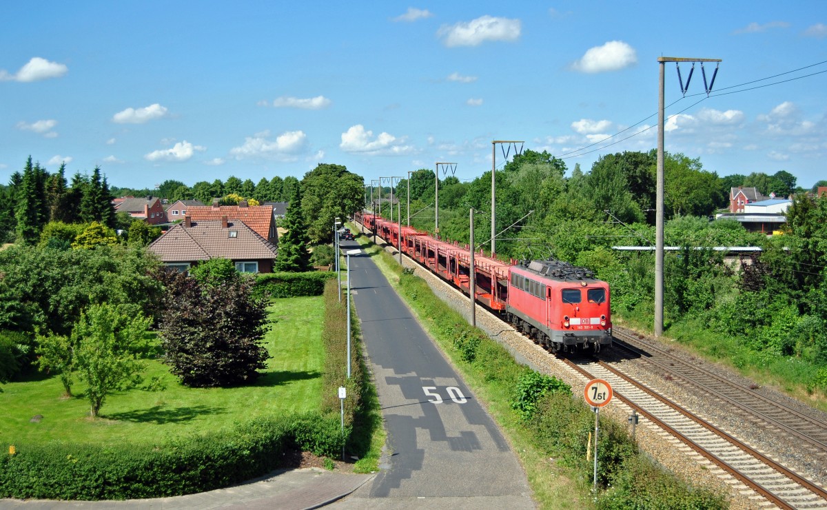 140 501-8 fuhr am 11.06.2014 mit einem Autozug von Emden nach Osnabrück, hier in Leer.