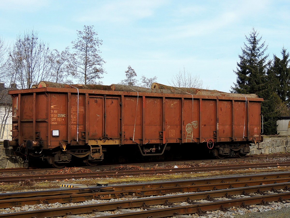 Eanos 3156(SK-ZSSKC)5377003-4; wartet mit Rundholz beladen am Bhf. Ried auf die Entladung; 140301