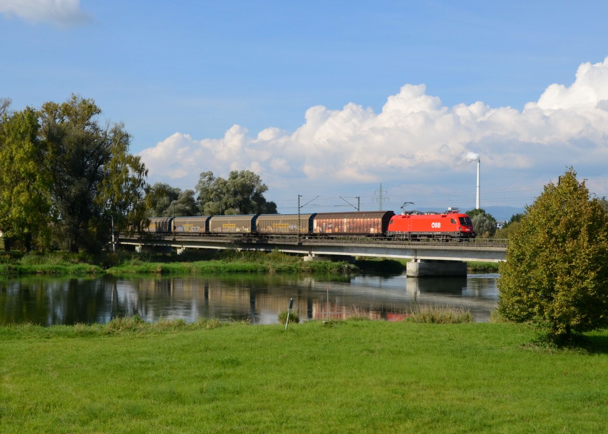 182 523 mit einem Containerzug am 16.09.2014 auf der Isarbrücke bei Plattling.