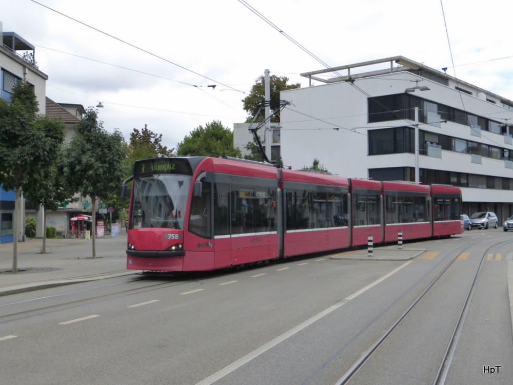 Bern Mobil - Tram Be 4/6 758 unterwegs auf der Linie 7 in Bümpliz am 30.08.2014