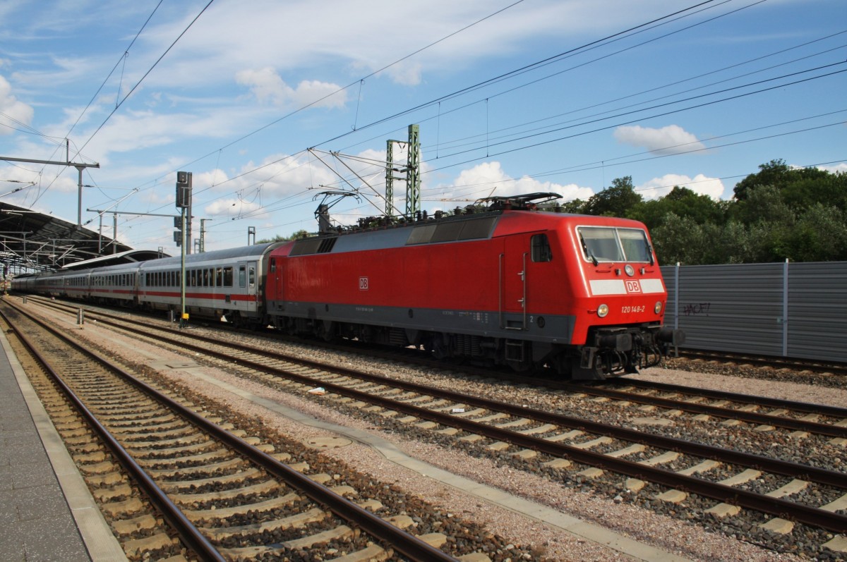 Hier 120 148-2 mit IC2154 von Leipzig Hbf. nach Wiesbaden Hbf., bei der Ausfahrt am 19.8.2014 aus Erfurt Hbf.