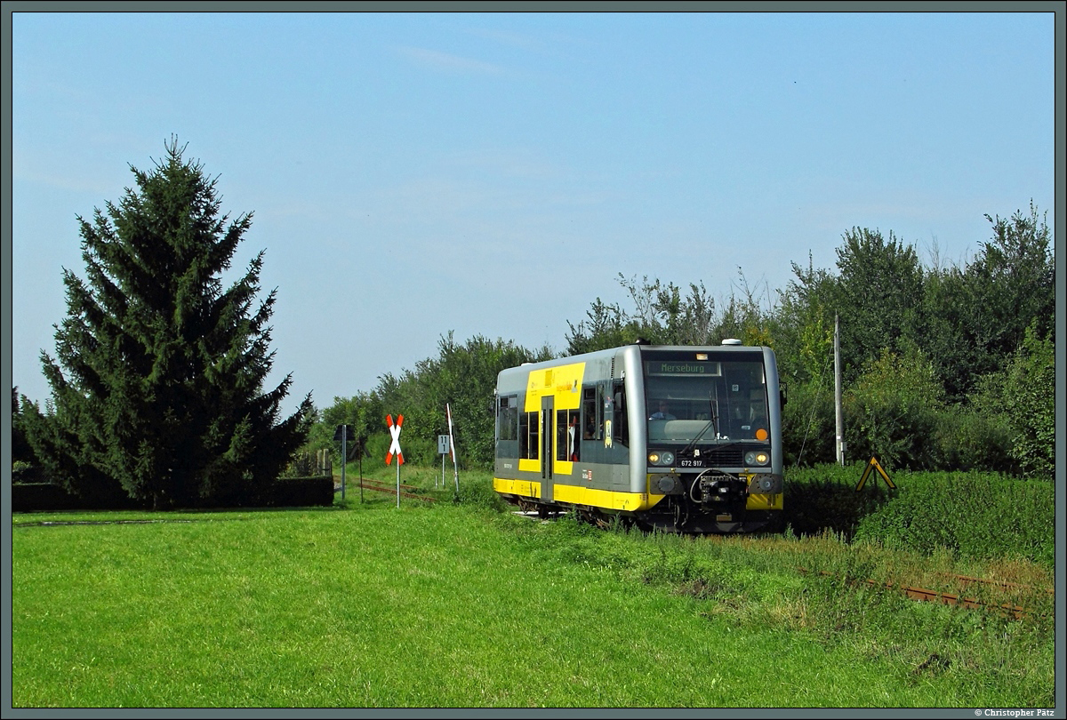 672 917 rollt am 16.09.2014 als RB 34915 über einen Bahnübergang in Bad Lauchstädt.