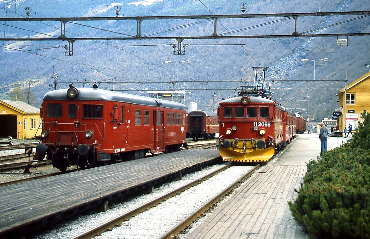 Im Mai 1988 steht El 11 2098 mit einem Zweiwagenzug abfahrbereit im Bahnhof Flam und wird gleich die nur 20 km lange Fahrt in das 866 m höher gelegene Myrdal beginnen