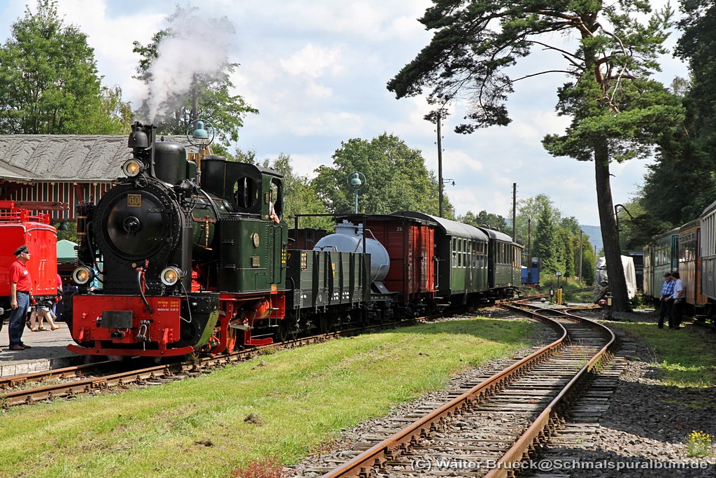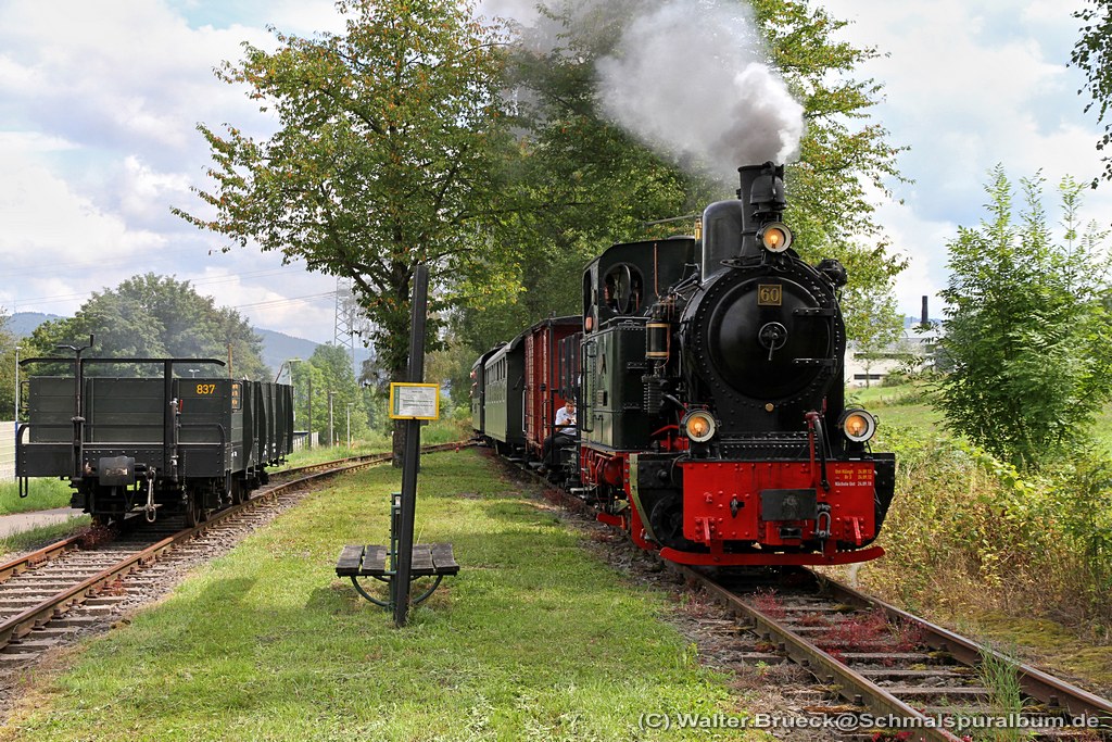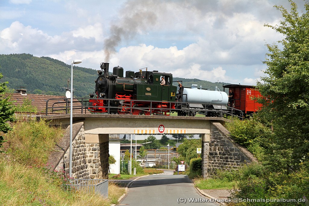 Feuerwehr-Fahrtag bei der Sauerländer Kleinbahn am 03.08.2014, hier Dampflok GB 60 "BIEBERLIES" bei der Ausfahrt aus Köbbinghauser-Hammer. Neben zahlreichen ausgestellten Feuerwehr-Oldtimern wurde im Rahmen einer Übung ein Bahnübergangs-Unfall simuliert. -- Komplette Bilderserie siehe http://www.schmalspuralbum.de/thumbnails.php?album=559