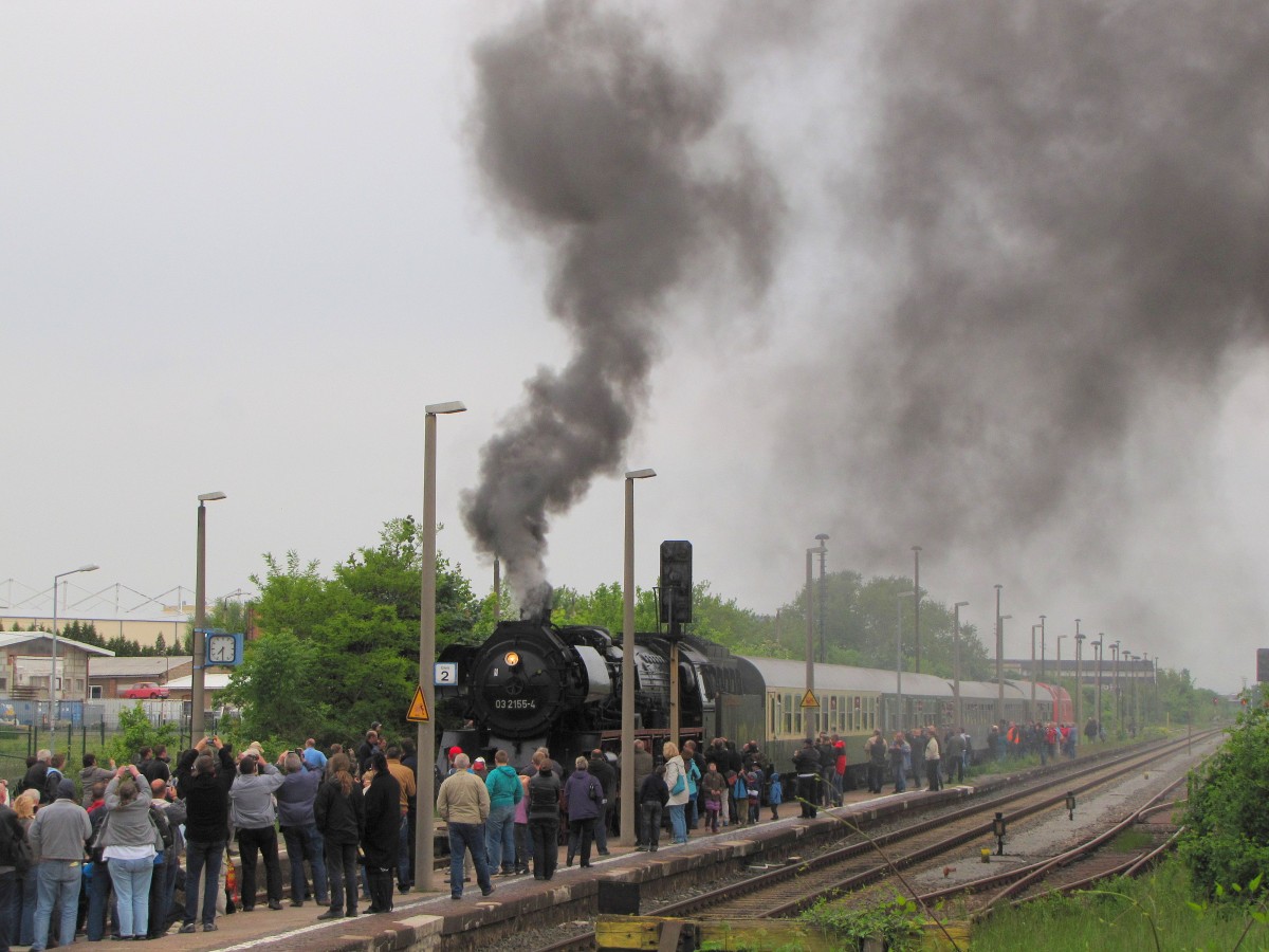 Zahlreiche Eisenbahnfans beim fotografieren und staunen, während der Scheineinfahrt der WFL 03 2155-4 mit dem DPE 32861 (Nordhausen - Weimar), 25.05.2013 in Erfurt Nord.