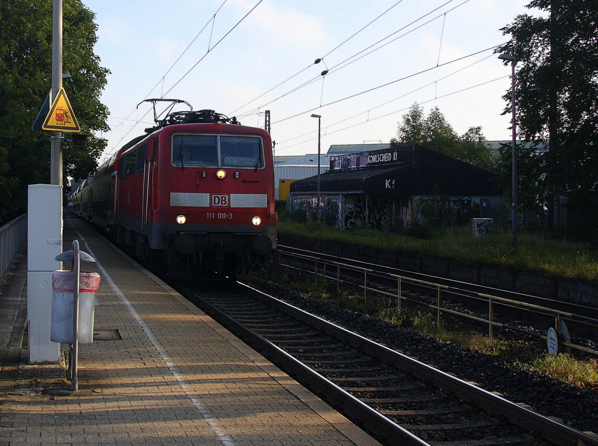 111 011-3 DB kommt pfeifent die Kohlscheider-Rampe hoch aus Richtung Neuss,Herzogenrath mit dem RE4 aus Dortmund-Hbf-Aachen-Hbf und fährt durch Kohlscheid in Richtung Richterich,Laurensberg,Aachen-West bei schönem Sonnenschein am Morgen vom 3.9.2014.