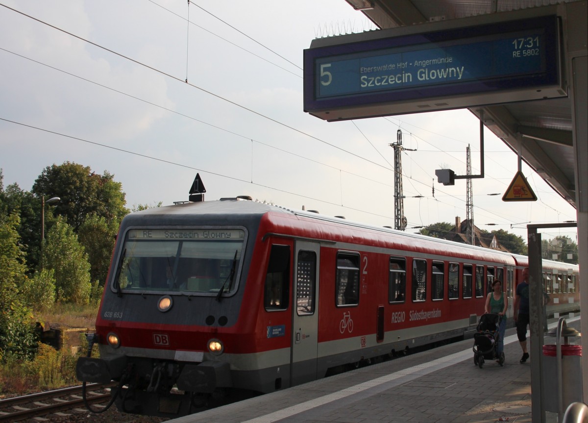 7.9.2014 Bernau bei Berlin. Südostbayernbahn meets Nordostbrandenburg. 628 653 als RE 5802 nach Stettin.