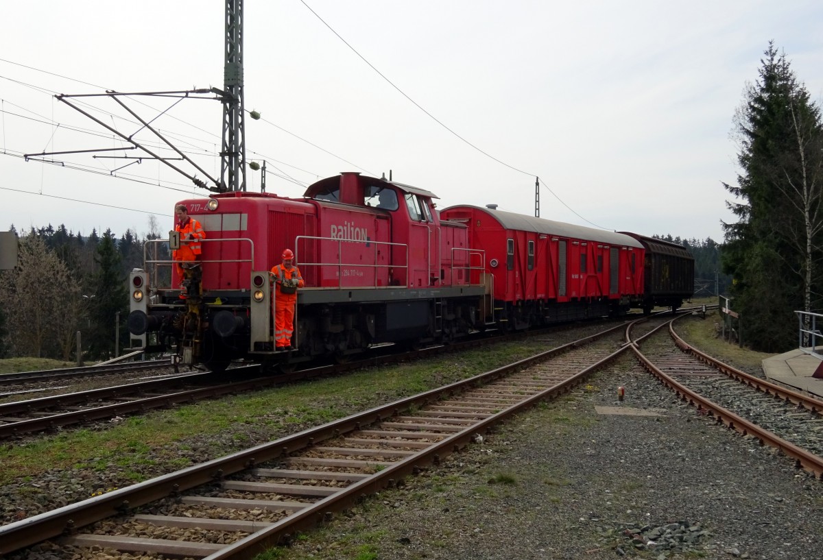 294 717-4 zieht am 11. April 2015 einen Hilfszugwagen und einen Schiebewandwagen aus dem Anschlussgleis der Firma Wiegand in den Bahnhof Steinbach am Wald.