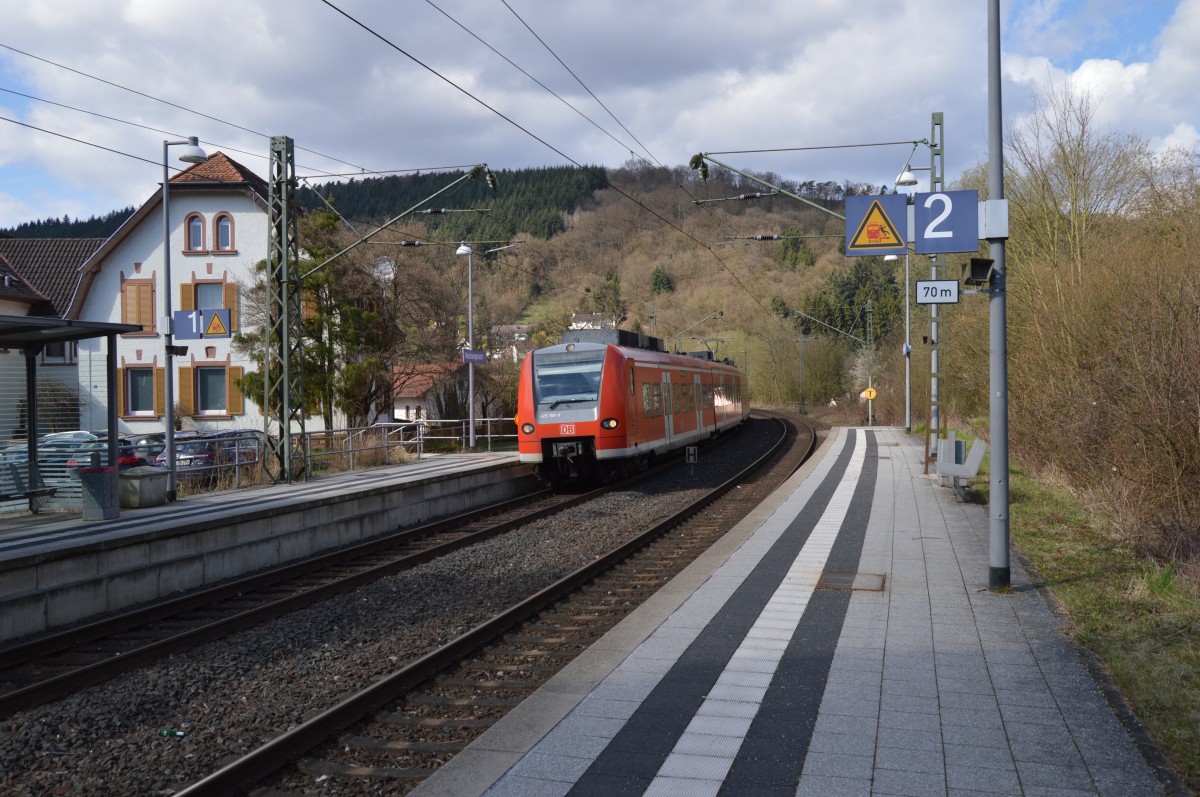 Bei der Durchfahrt in Neckargerach ist der 425 768-9 hier am 2.4.2015 zu sehen.