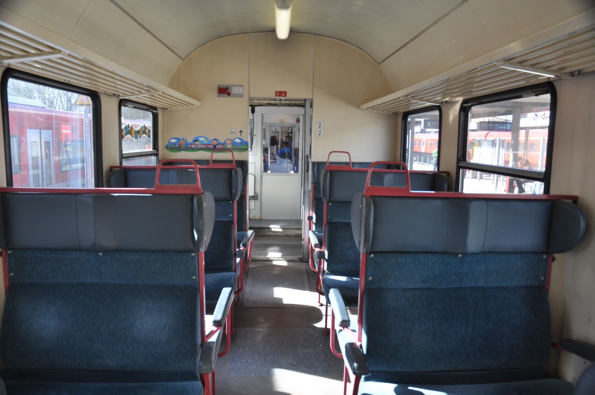 Blick durch den Ganzen Wagen im Hannover-Grün Design des 82-34 154 Bnrdzf 463.1 Eingereit am 08.04.15 im RE Memmingen - München HBF.