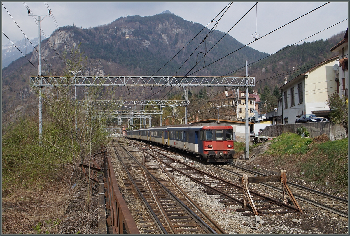 Im Frühling ist es im Tessin besonders schön. Am 10. April 2015 hat der RABe 524 015 auf seiner Fahrt von Cadenazzo zum Aeroporto Milano-Malpensa gerade die Station San Nazzaro am Lago Maggiore verlassen.