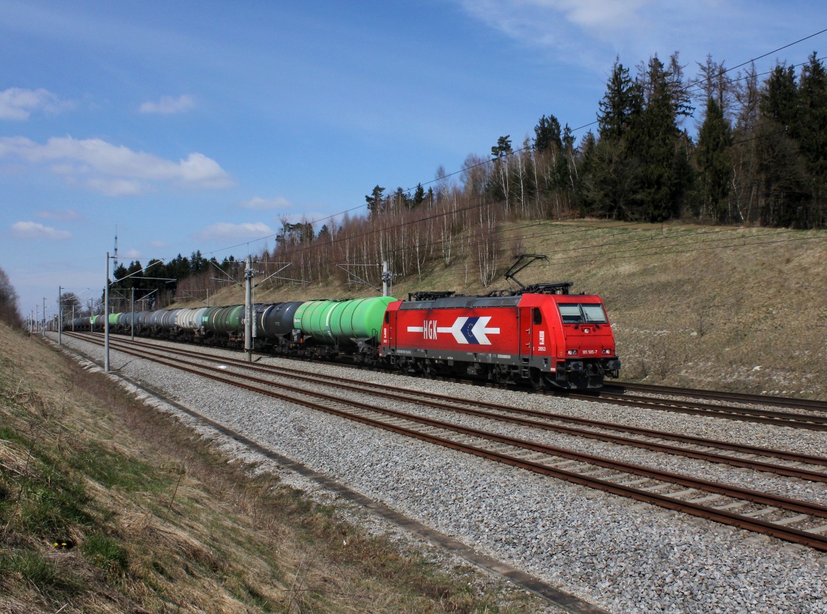Bei Fischeln kommt die 145-CL 015/145 093-1 + 185 526-1 für die RHC fahrend mit einem Tankzug. 12.4.2015