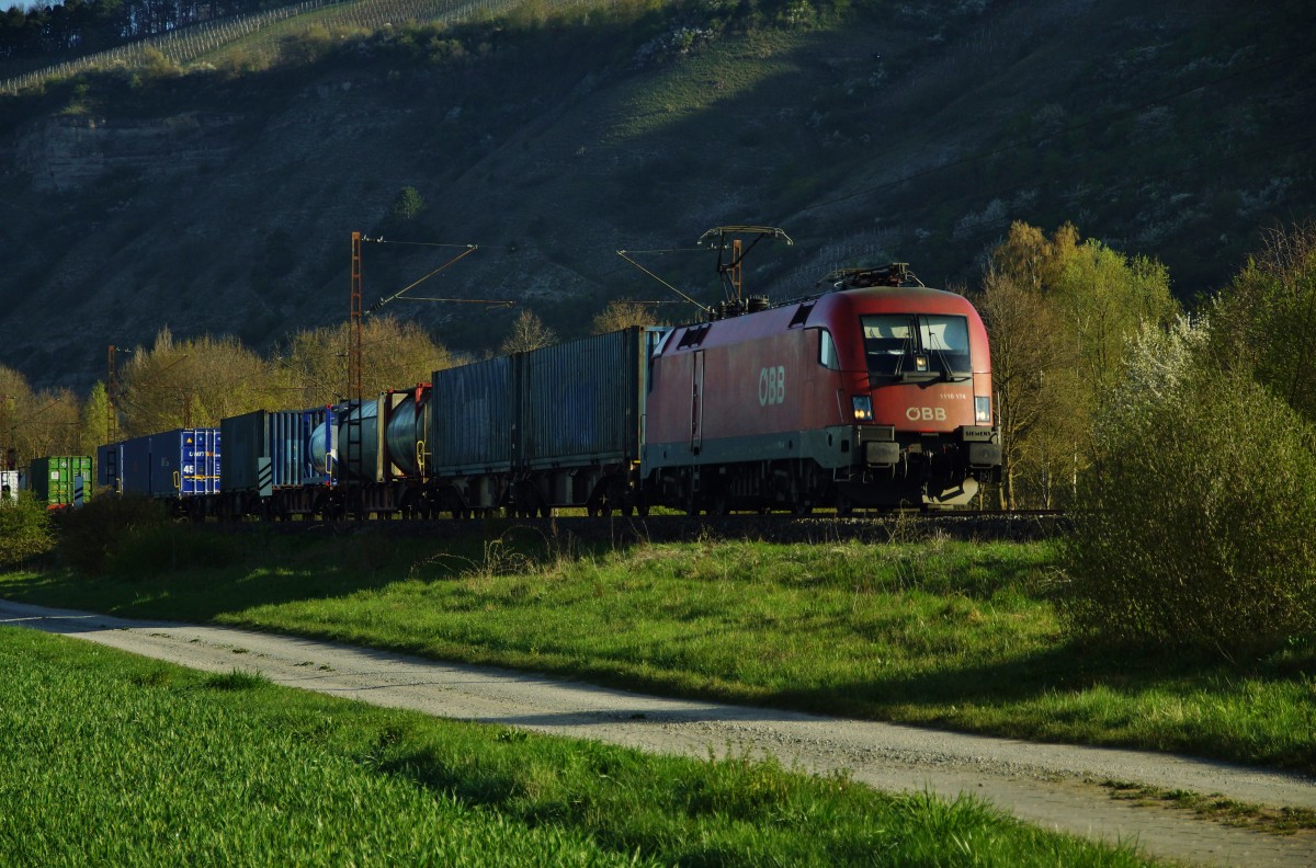 1116 174 ist hier mit einen Containerzug unterwegs zu sehen am 15.04.15 bei Thüngersheim.