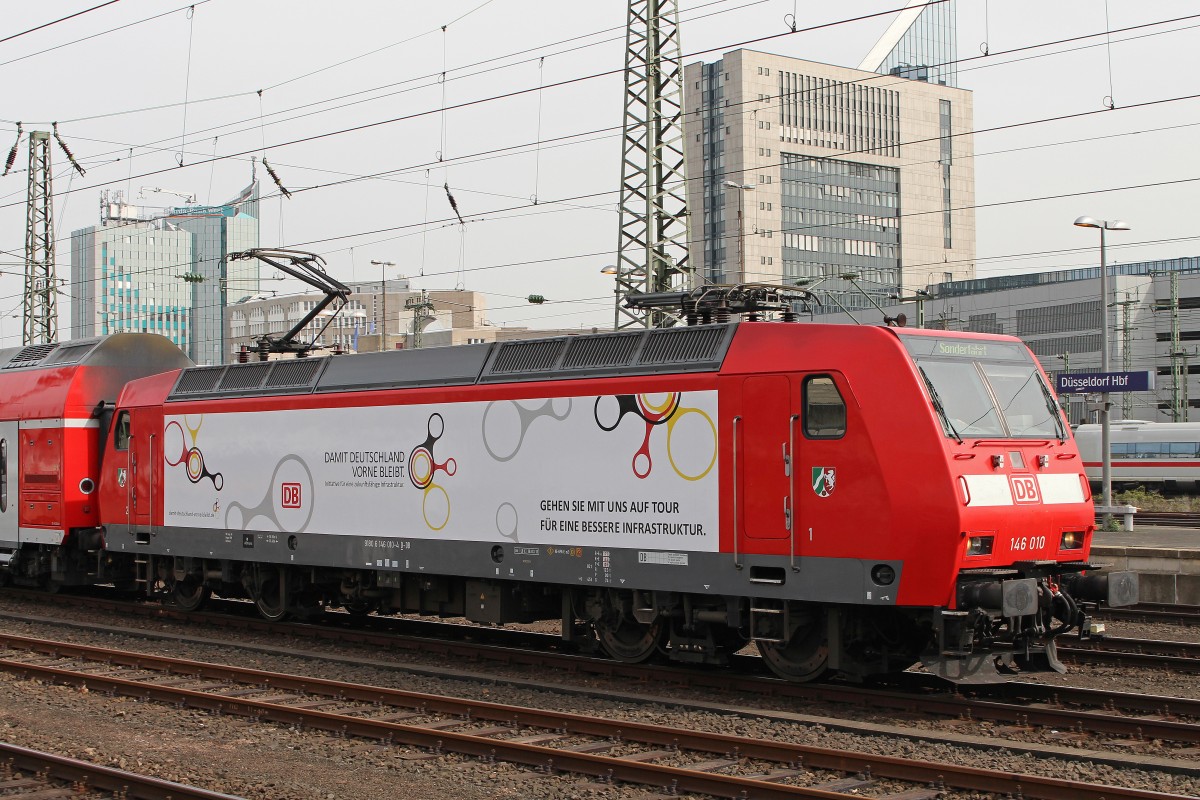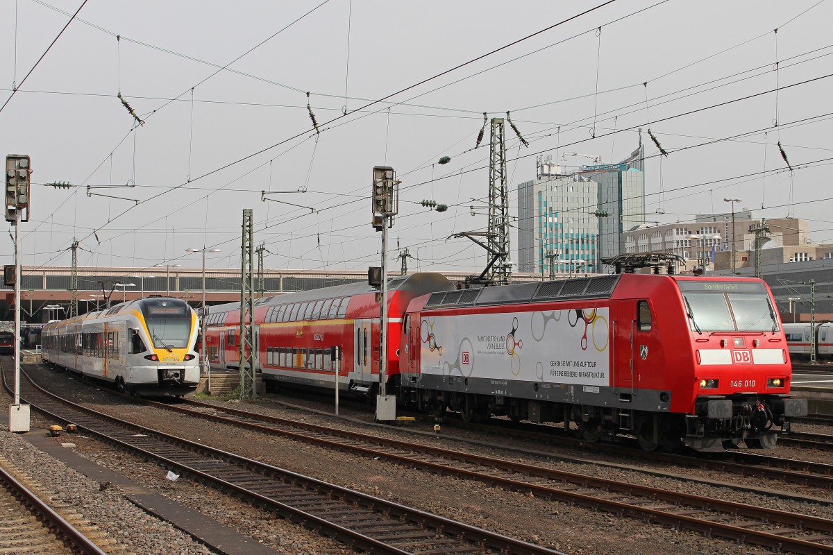 146 010 am 31.3.14 mit zwei Dostos auf Presentationsfahrt in Düsseldorf Hbf.