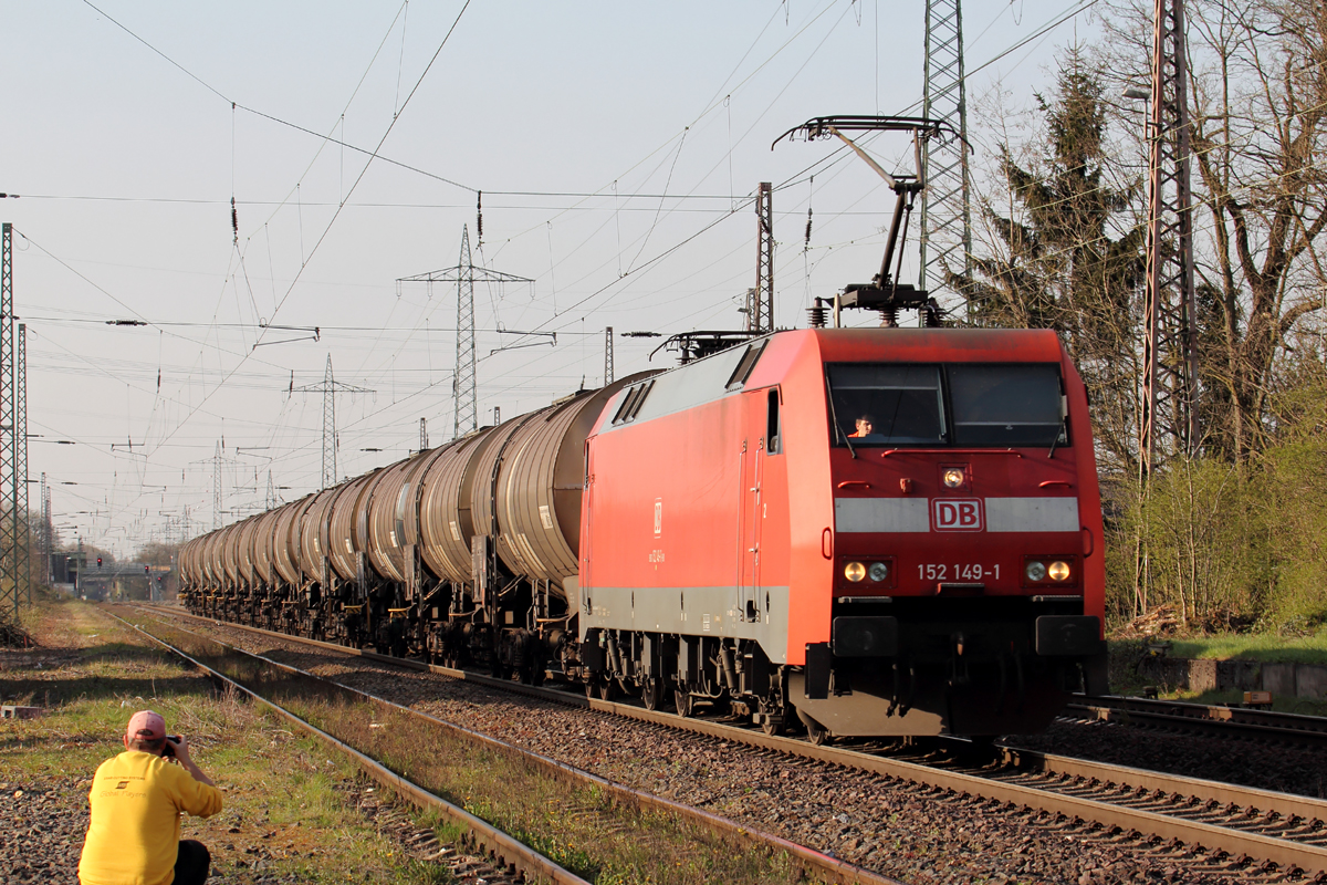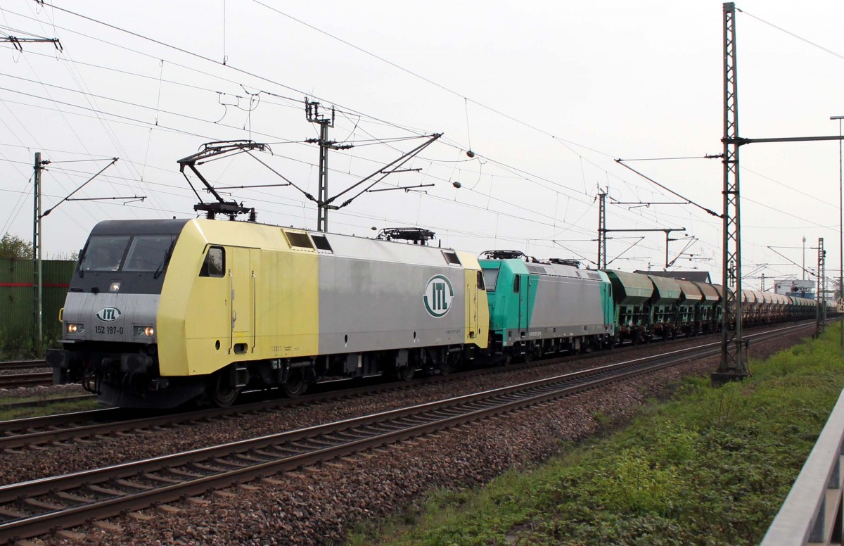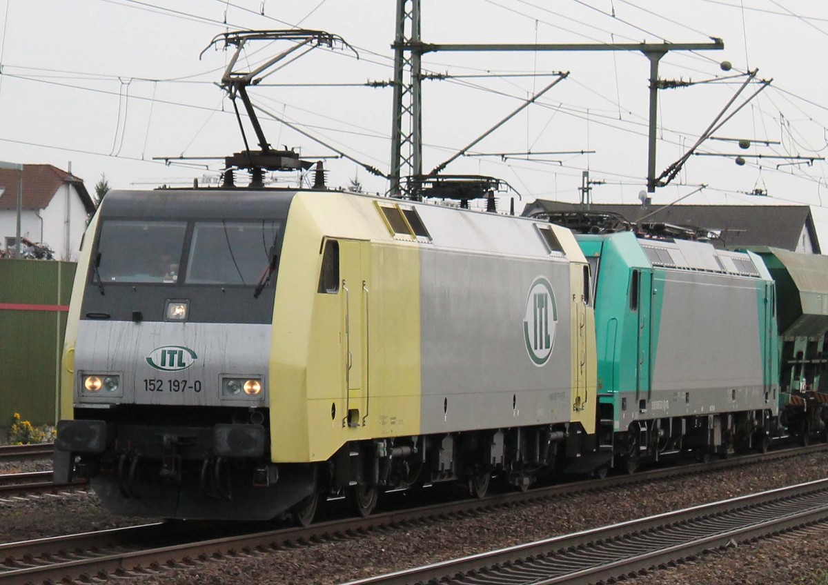 152 197-0 als Doppeltraktion mit 185 633-5 der ITL am 16.4.2015 gegen 16:10 Uhr auf der Riedstrecke in Richtung Norden im Bahnhof Riedstadt-Goddelau. Ab 16:50 Uhr stand dieser Zug, durch einen Fehler des Fahrdienstleiters, auf Gleis 4 des Frankfurter Hauptbahnhofes. Sein Ziel war der Südbahnhof