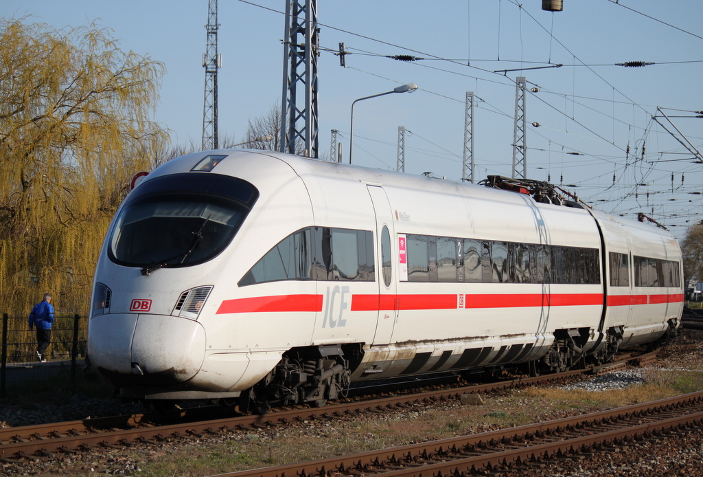 411 519-2 als ICE 1509 von Warnemünde nach München Hbf bei der Ausfahrt im Bahnhof Warnemünde.18.04.2015