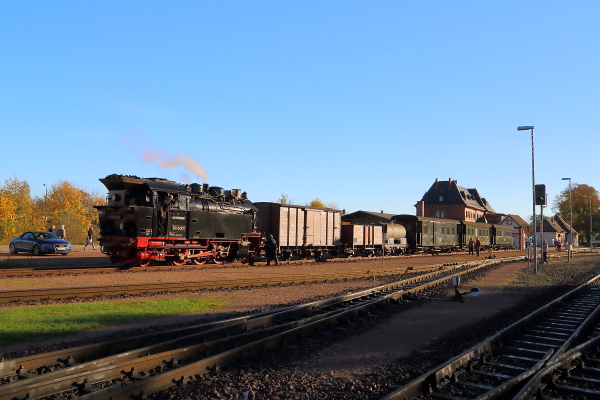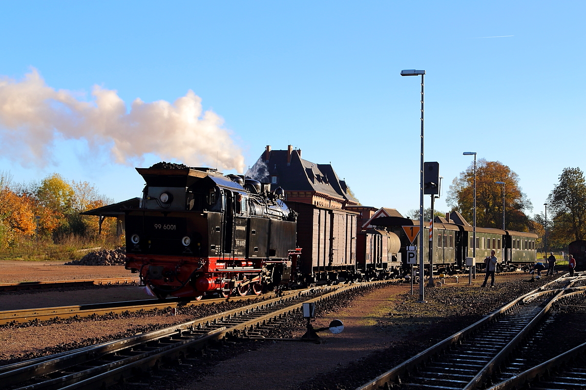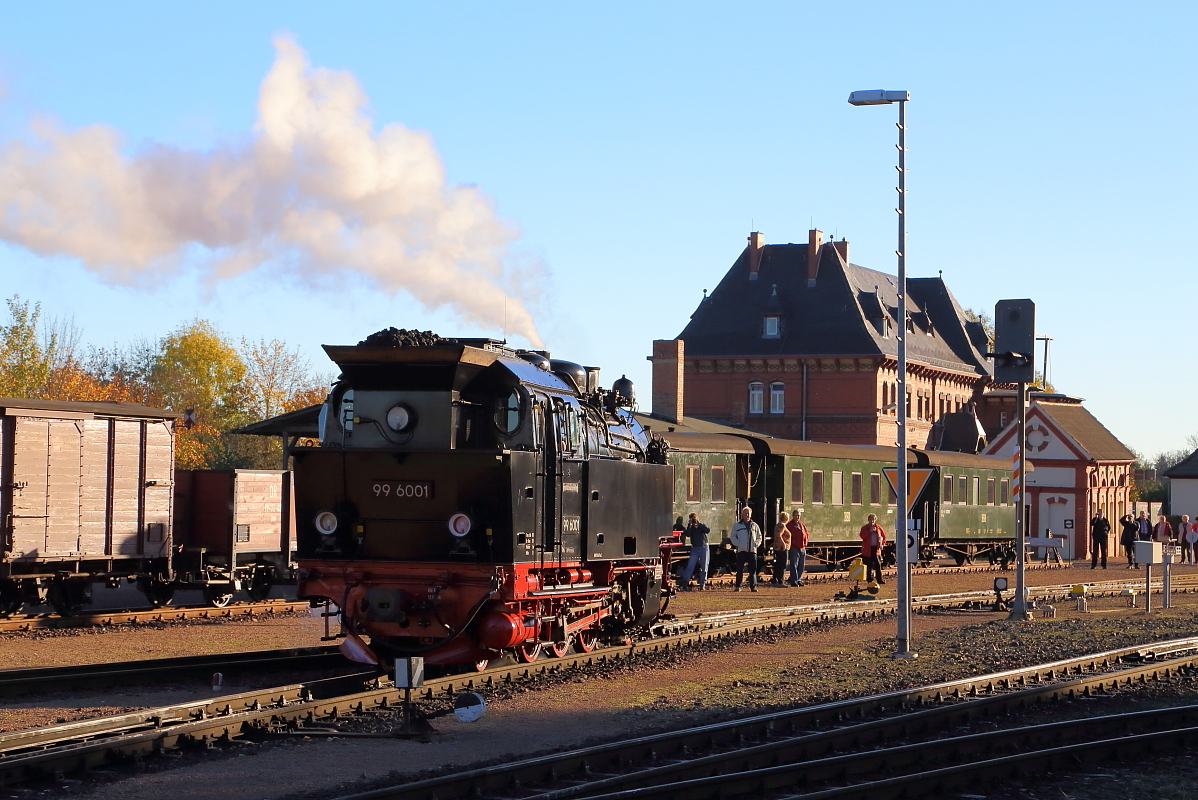 99 6001 am Morgen des 19.10.2014 beim Bereitstellen des Sonder-PmG`s der IG HSB auf Gleis 2 im Bahnhof Gernrode. Danach wird die Maschine ans andere Ende des Zuges umsetzen, um mit ihm dann zu einer Fotofahrt nach Alexisbad, Harzgerode und Silberhütte zu starten.