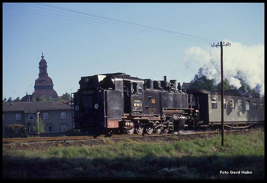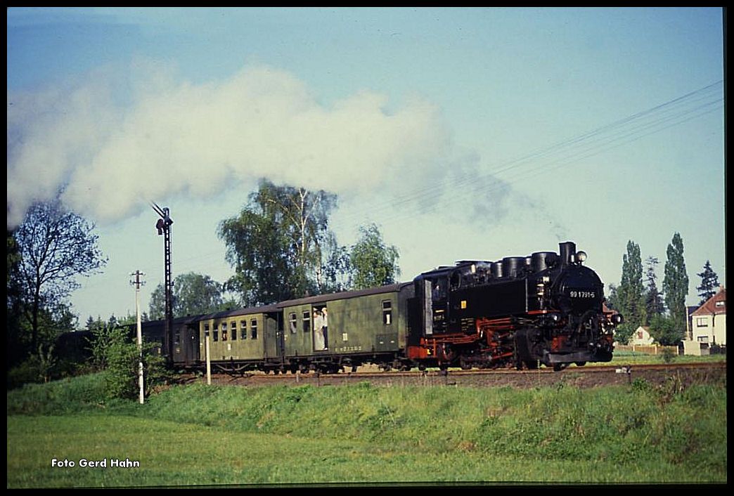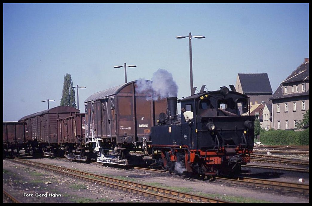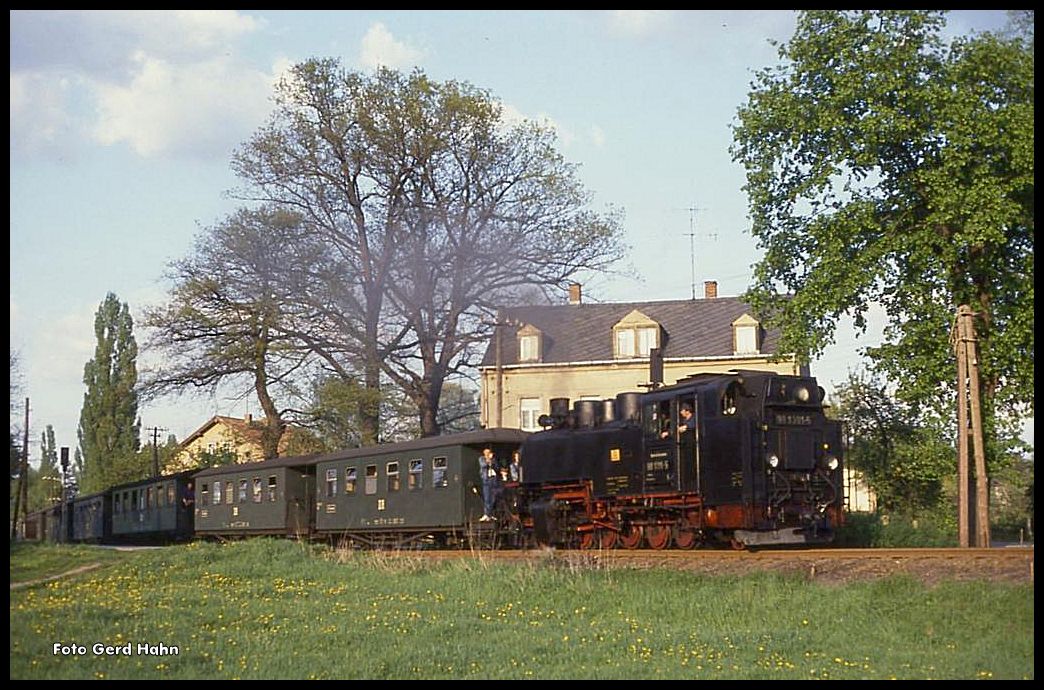Zugkreuzung im Bahnhof Moritzburg am 4.5.1990 991791 ist mit dem Personenzug nach Radeburg eingefahren.