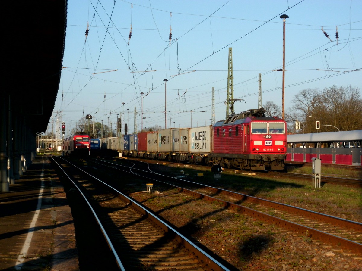 Am 18.04.2015 kam 180 008 mit ihrem Containerzug aus Richtung Magdeburg nach Stendal und fuhr weiter nach Hannover.