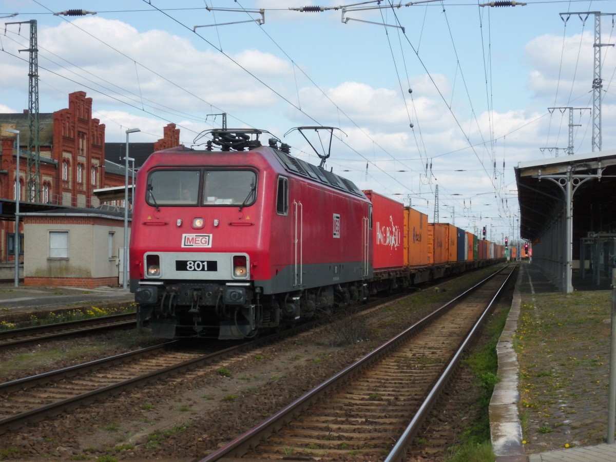 Am 18.04.2015 kam MEG 801 (156 001) mit ihrem Containerzug aus Richtung Magdeburg nach Stendal und fuhr weiter nach Wittenberge.