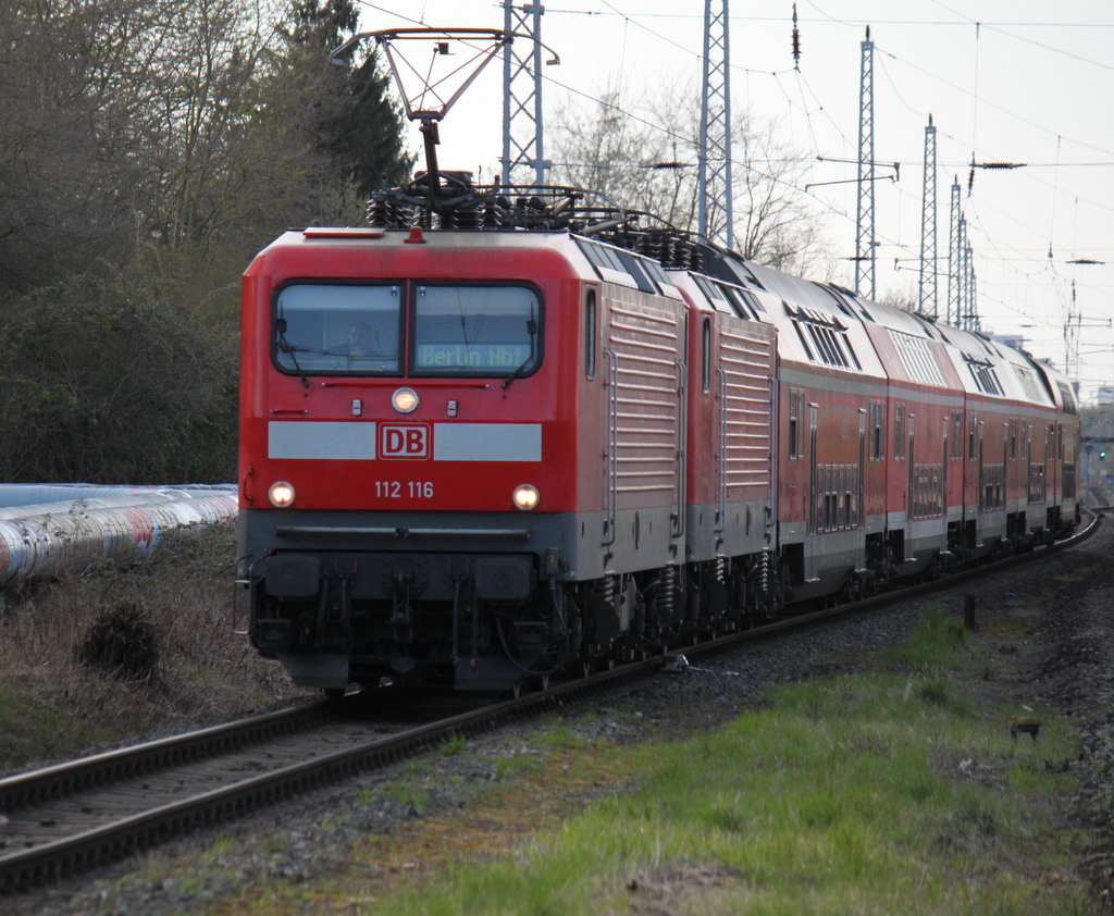 Die Berliner 112 116-9+112 189-6 mit RE 18591 von Warnemünde nach Berlin Hbf(tief)bei der Durchfahrt im Haltepunkt Rostock-Bramow,18.04.2015