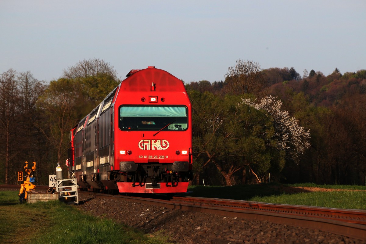 Die "Künstlerische" Beklebung der Dosto Wagen der Graz Köflacher Eisenbahn mag Geschmackssache sein. BS 205 mit seinem Satten Rot an der Stirn ist allerdings genau mein Fall. 17.04.2015 bei Wies Markt
