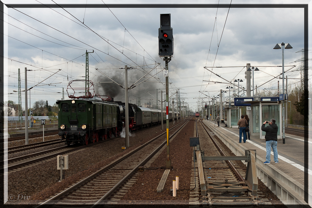 E 77 10 fährt am 18.04.15 durch Heidenau. Foto vom Bahnsteigende!