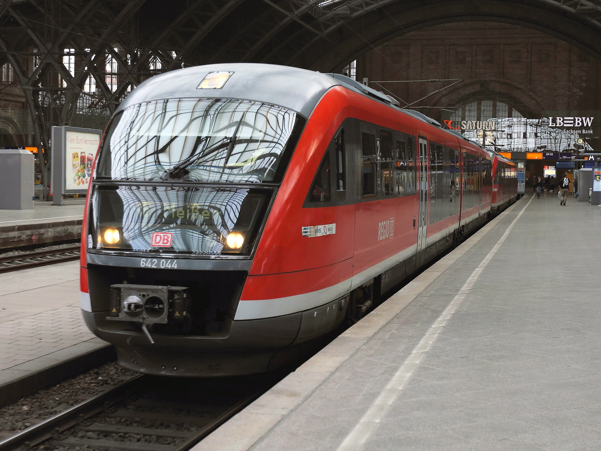 Leipzig Hauptbahnhof, Bereitstellung von 642 044 / 544 mit 642 130 / 630 als  RB 26384 nach Meißen  am 16. Mai 2015 auf Gleis 19.