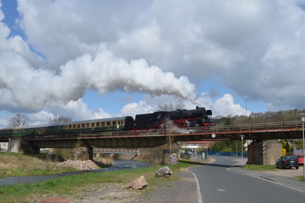 Zum 7. Dresdner Dampfloktreffen gab es einen Sonderzug nach Nossen und zurück nach Dresden mit 35 1097-1 hier auf der Freiberger Mulde Brücke in Nossen 18.04.2015