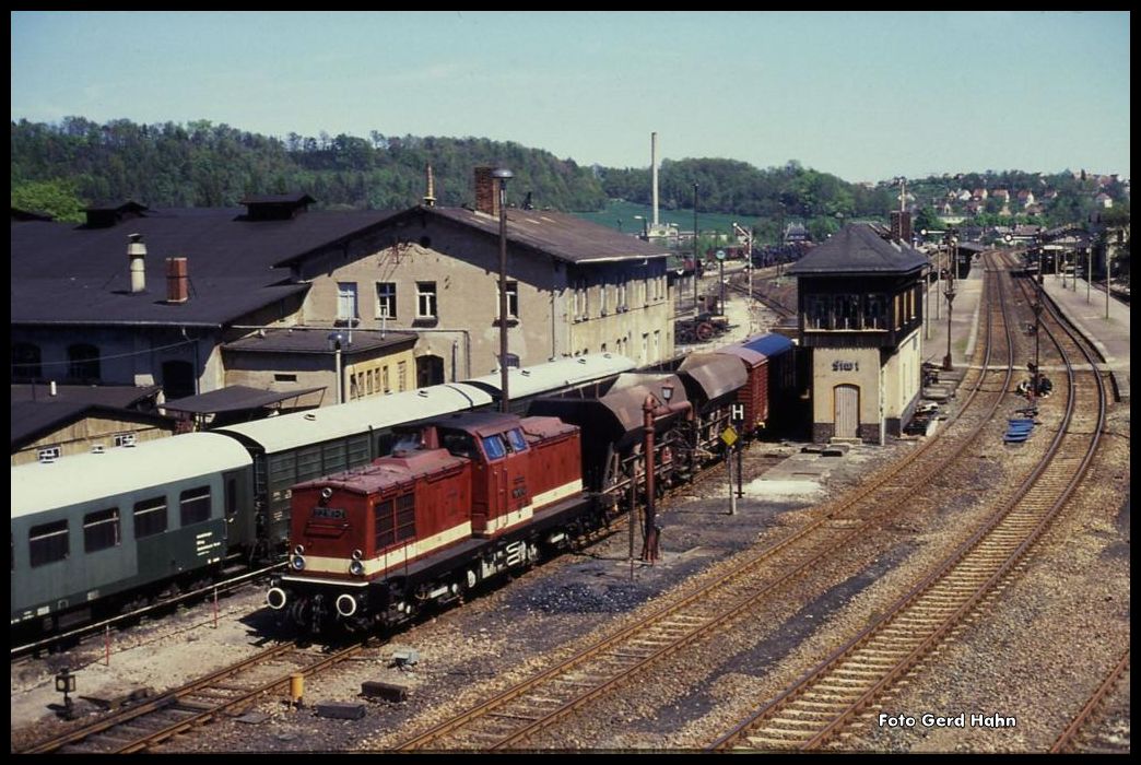 112167 mit einem Schotterzug am 3.5.1990 um 15.10 Uhr im Bahnhof Nossen.